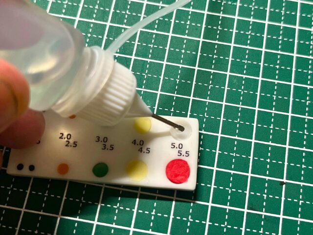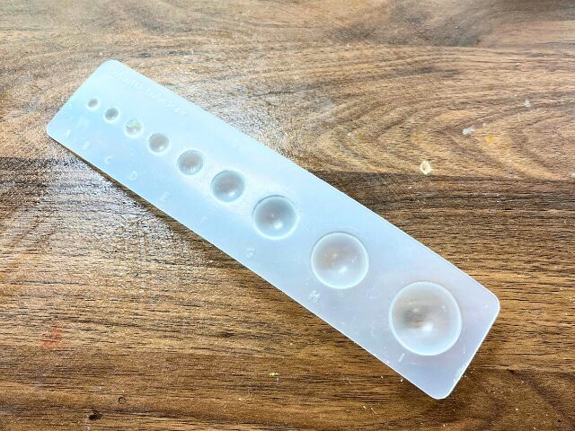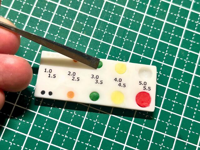 このカラースケールで計量できる粘土の一番小さいサイズは”A”で、これで計った粘土をまるめると、おおよそ4mmくらいの玉になります