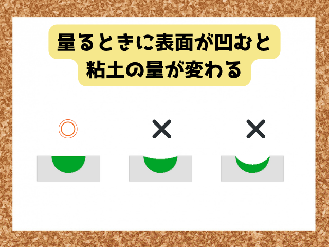 これは、スケールに詰め込んだ粘土をすり切る際に、指で”ぐいっ”とすると、すり切った面が平らにならないことで起こっています